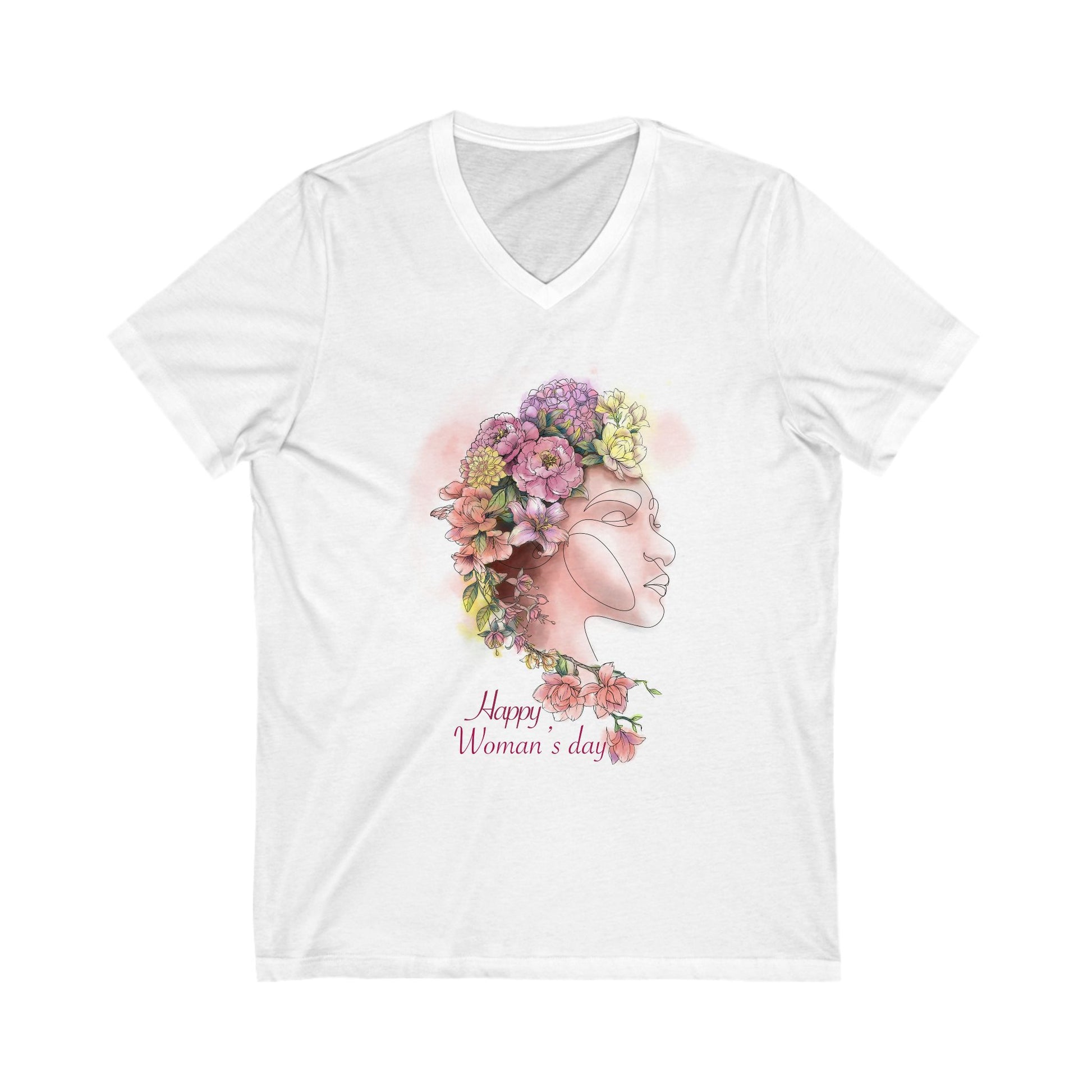Introducing a stylish Unisex Jersey Short Sleeve V-Neck Tee that effortlessly combines comfort and trendiness. This tee features a beautiful floral design celebrating Woman's Day, bringing a positive, uplifting vibe that's perfect for showcasing appreciation and love during special occasions. It is versatile enough to wear at gatherings, casual outings, or even relaxed days at home. Ideal for anyone looking to express their individuality and support women's empowerment, it makes for a wonderful gift for friends, family, or yourself. Perfect for holidays and celebrations like International Women's Day, birthdays, or simply as a treat for a special lady in your life. Product features - Made from lightweight, 100% cotton fabric for a smooth feel. - Stylish V-neckline and retail fit ensure versatility in any wardrobe. - Side seams provide structural support, enhancing durability. - Ribbed knit collar retains shape and adds comfort. - Ethically produced by Bella+Canvas, ensuring humane working conditions. Care instructions - Do not dryclean - Machine wash: warm (max 40C or 105F) - Non-chlorine: bleach as needed - Tumble dry: low heat - Iron, steam or dry: medium heat